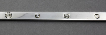 Description: An interesting 17th century style silver notched 2 pronged fork, a replica of the earliest known English table fork. The fork has 3 notches at the top of the stem, a rare feature seen occasionally on puritan spoons. The original, made in 1632, is known as the Manners Fork, and is in the V&A museum in London. The original belonged to the Rutland family of Haddon Hall, and has the crest of John Manners, 8th Earl of Rutland. This fork is a good gauge, very pleasing to use, we tested it on cold meats and olives! The hallmarks are excellent, and include makers mark FH for Francis Howard, the firm worked between 1900 and 1986. A real talking point for your dinner table. Note: - we now have another example of this fork, S 1808, also in original box