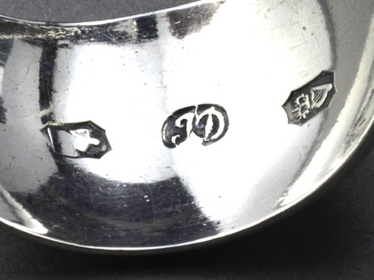 Description: A beautiful Irish Georgian silver sugar tongs, with bright cut engraving, Irish "Star" and shell style bowl. The tongs also have a well engraved Lions head family crest in one of the cartouches on the side. No initials are engraved on the bow. The tongs are very good quality, as you would expect from Irish Georgian silver. The tongs have 3 hallmarks, crowned harp for Dublin in rectangular punch with cut corners (used 1793-1809), makers mark JD in script in oval punch, and Hibernian duty mark. No date letter is present, as is usual on Georgian silver tongs (Hodges, Georgian Silver Sugar Tongs, pg 198). John Daly worked between 1786 and 1809, from the style of the tongs we place them circa 1795. Irish tongs by Daly are probably rare, as they were not recorded by Hodges in the book described above.