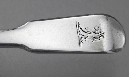 Description: A Chinese Export (or China Trade silver) silver tablespoon, with excellent pseudo hallmarks. The spoon is Fiddle pattern, and has an attractive and well engraved family crest, a Lion's head erased, which is contemporary. The hallmarks include pseudo sterling lion, pseudo crowned leopard's head, date letter "C', and pseudo Georgian duty mark. We have tentatively ascribed these marks to Cutshing, we would welcome other opinions. These marks are typical of the pseudo English marks deliberately created by Chinese silversmiths, for the export market. Cutshing are "widely recognised as producing some of the finest silver from the early China Trade period (1785-1840)" - www.chinese-export-silver.com, article on Cutshing.