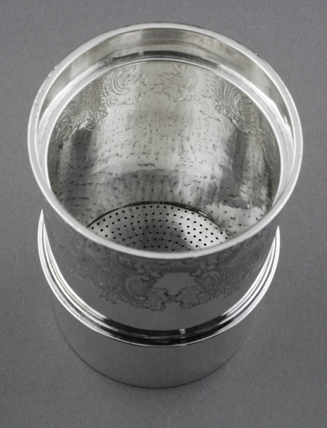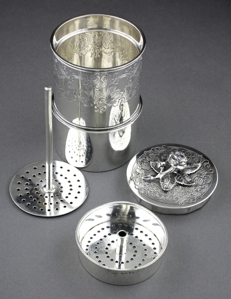 Description: A rare early Victorian coffee percolator, we have been unable to trace a similar example in the literature or internet. The percolator consists of 4 separate components, all sterling silver. The first is a cylinder with a finely perforated base, this has 3 rims, the top to hold the lid, one two-thirds of the way down, we presume to hold the cylinder in a coffee pot, and the third inside to hold the coffee container. The top portion is finely engraved with shells and c scrolls, which matches the lid. The second is the lid, which has a beautifully cast rose finial, which acts as the handle, held in place with a hand made silver wing-nut, the lid is also finely engraved. The third is a cylindrical coffee container, also perforated but with larger holes, and central cylinder to hold plunger, this sits inside the main cylinder snugly. The fourth is the strainer or plunger, with central silver rod, and flat perforated base, also large holes. All the components are pleasing quality, this was a well made item. A coffee percolator is described by Newman (Illustrated Dictionary of Silverware, page 80) as a device for infusing coffee by causing hot water to filter repeatedly through ground coffee. He describes a cylindrical receptacle, with interior perforated bottom receptacle, and flat circular strainer. The interior fittings are removable so that the coffee pot can be used to serve when made. All 4 items are fully hallmarked, the rose finial and wingnut are also hallmarked, another sign of quality. William Morisse worked between 1831 and 1853, he seems to have specialised in tea and coffee pots. Please note the original coffee pot that this percolator would have been used with is not present, we assume it was separated and used separately. We would welcome information on similar items.