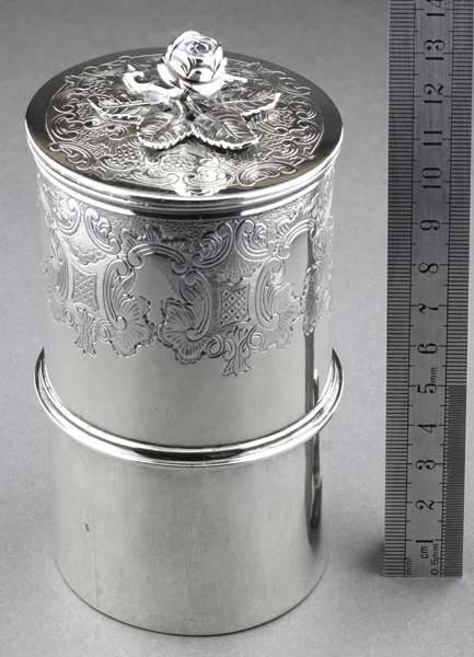 Price: $ 210.00 Weight: 367 grams Dimensions: 12.8 cm height, 7.0 cm diameter Condition: Very good, 3 cm dent to base, small dents to rim of lid from use.