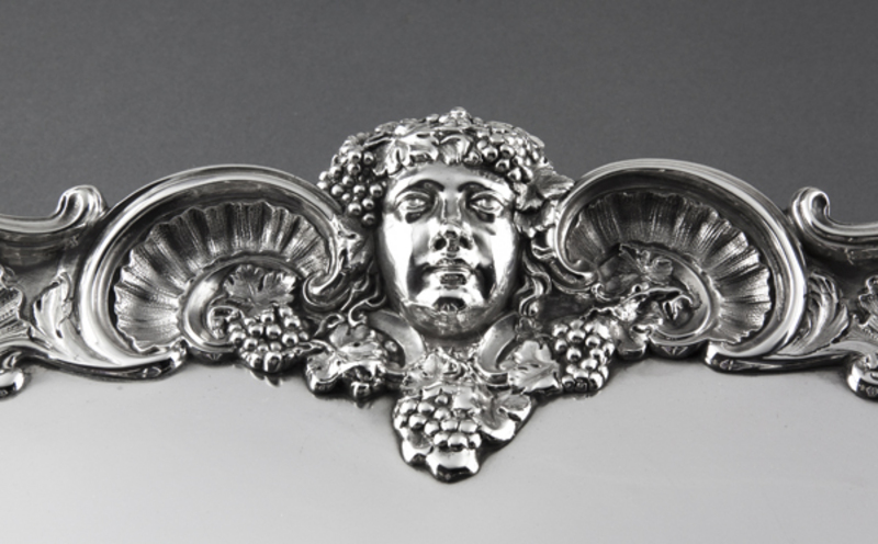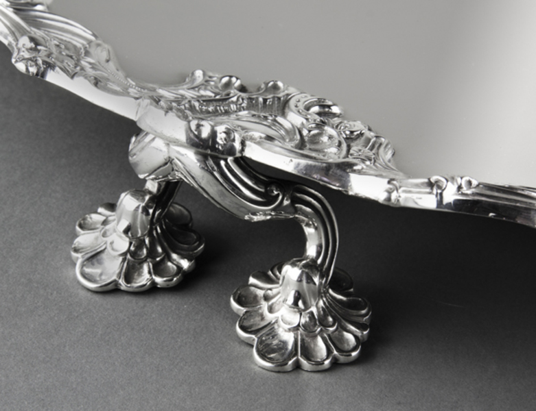 Description: A magnificent Elkington silver salver, of very generous proportions, circular with a cast border decorated with 4 faces (the 4 seasons), and an elaborate shell and scroll border. The salver is exceptional quality and weight, weighing 4.65 kilogrammes (164 ounces), so this is a very large and heavy salver. The salver rests on 8 shell feet (4 double feet). It has very clear hallmarks, and is also stamped "Elkington & Co, 31921", which is probably a pattern number. The four faces are as follows: