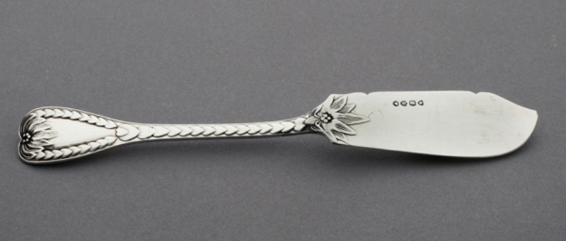 Description: An extremely rare Victorian silver Palm pattern butter knife, with initial W. Pickford describes the rarity of Palm pattern in his book "Silver Flatware", pg 148, this is the only Palm pattern butter knife we have seen. The hallmarks are clear, but the makers mark is worn. Palm pattern appears in the Chawner & Co (George Adams) pattern books, who were the most important 19th century silver flatware makers. Please note we also have Palm pattern soup spoons (S1612), made by George Adams in 1876.
