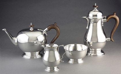 Description: A lovely reproduction early Georgian silver tea set, comprising bullet teapot, hot water jug, sparrow beak milk jug and circular sugar bowl. The teapot is almost spherical, with a c scroll wooden handle, octagonal spout and circular foot. The hinge is applied, the circular lid fits snugly, and it has a baluster finial with wooden knob. This reproduces a popular early Georgian style, circa 1725. The hot water jug is baluster shape, with a domed lid, matching finial, handle and circular foot. The sparrow beak milk or cream jug is also baluster shaped, has a silver scrolling handle and matching circular foot. The sugar bowl is circular with a moulded rim, and matching circular foot. The set is very good quality and weight (just under 2 kilogrammes in total), it is a pleasure to use - this high quality is often seen in the antique silver reproductions of earlier styles made between the 2 World Wars. All 4 pieces are fully hallmarked, with clear hallmarks, 3 pieces are also stamped "Made in England". Both lids are also hallmarked, even the 2 wing nuts holding the finials in place are hallmarked - a sign of quality. The water jug makers mark has been over stamped by a retailers mark A.S in rectangular punch with canted corners, for Alexander Scott, who was based in Glasgow between 1920 and 1960 - this jug has an additional mark "Scott". The jug was still made by Wakely and Wheeler, just enough of the remnant mark can be seen under the over stamp - so we assume the set was made in London but retailed in Scotland. Wakely & Wheeler have been leading British silversmiths throughout the 20th century, they still exist today. The firm traces it's roots back to 1791 to Henry Lias.