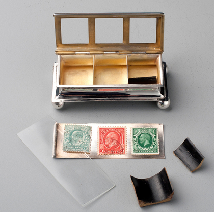 Antique Silver triple stamp box, open, with 2 wooden inserts