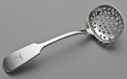 Description: An Exeter silver sifter ladle in the Fiddle pattern, with an engraved family crest featuring a dog or wolf. The sifter is the traditional shape, with beautiful scroll and cross-hatch piercing. The hallmarks are excellent, and include makers mark JAP, Victoria duty mark, lion passant, castle town mark and date letter gothic C for 1839. James Andrew Page worked between 1833 and 1862 in Plymouth, he died in 1898. In 1862 the business became Page, Keen & Page, which survived being destroyed by bombs in 1941, and merged with Bowdens in 1970. Page, Keen & Page produced interesting silver replica spoons complete with early Plymouth hallmarks.