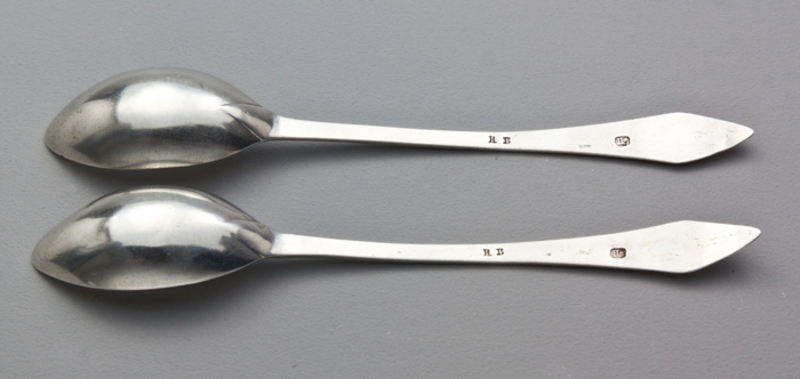 Description: A rare pair of Cape Silver lemoen lepels (orange spoons), with an interesting provenance, they featured in the book Cape Silver and Silversmiths by Stephan Welz, pg 93. The spoons are the traditional lemoen lepel shape, with narrow, pointed boat shaped bowl, and triangular terminal, and Cape prick engraving. The spoons have a very elegant shape, the bowls deep and curved, the drop is distinctly v shaped, they have a lovely feel in the hand. Both spoons are clearly hallmarked with makers mark IL in rectangular punch for Jan Lotter, and also are punched with initials HB, we assume the original owner. Welz describes orange spoons as"probably the most attractive type of spoon made at the Cape, derived from Dutch spoons", pg 95. He also notes that all known examples are by Cape born silversmiths of the early 19th century (so not made by the more prolific English immigrants who arrived after 1815). Jan Lotter, who died young after a short career (1813-1817), was part of the Lotter family of Cape silversmiths, he made most of the known examples of Lemoen lepels. David Heller, History of Cape Silver, who describes orange spoons as "exquisite".