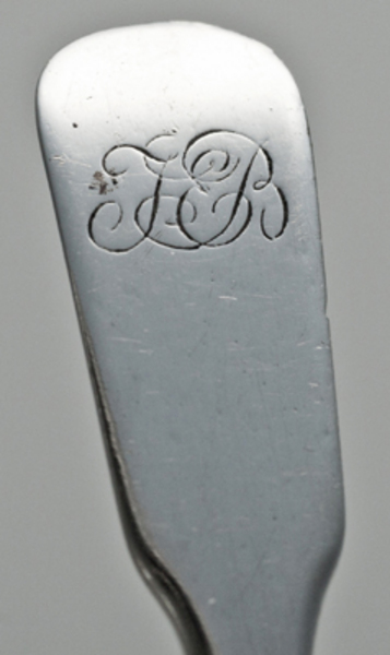 Description: A Cape silver salt spoon, in the Fiddle pattern, with original gilded bowl, and original owners initials TB. The original gilding is a light lemon colour, worn and scratched from use, but still clearly visible and quite charming. The hallmarks are clear, and include makers mark PD for Peter Clarke Daniel, alongside pseudo hallmarks date letter B in indented punch and Georgian duty mark (Welz mark 42, page 148, Cape Silver). Peter Clarke Daniel was born in Dublin, he arrived in the Cape with the 1820 settlers as a child.