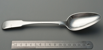 Description: A Cape silver Fiddle pattern tablespoon, with a set of extremely rare Cape silver hallmarks. The hallmarks include makers mark LT, and pseudo marks that include date letter A, lyre and duty mark. These marks are shown by Welz in his book Cape Silver (mark 144, page 156), they are also shown by David Heller in his book History of Cape Silver (mark MM84, page 156). The makers mark, A and lyre mark are well struck and very clear, the duty mark is worn at the top. The date letter A is quite distinctive, with one arm much thicker than the other.