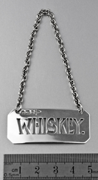 Description: An interesting and rare silver wine label, in Art Nouveau style. The label is rectangular with canted corners, and has been pierced WHISKEY in Art Nouveau style, in a font that closely resembles the Charles Rennie Mackintosh Glasgow school. Whiskey spelt with an E indicates Irish whiskey, Scottish whisky is spelt without the E. The hallmarks are struck on the front of the label, and are very clear, including the W&H in flag punch, they worked between 1884 and 1960, when they were incorporated into Mappin & Webb. British Art Nouveau silver wine labels are rare, the book "Wine Labels 1730-2003" by John Salter, states that "perhaps surprisingly, there seems to have been no record of British Art Nouveau labels", further noting the "only Art Nouveau labels known are American and Continental". Note: we have a matching label for BRANDY S1849.