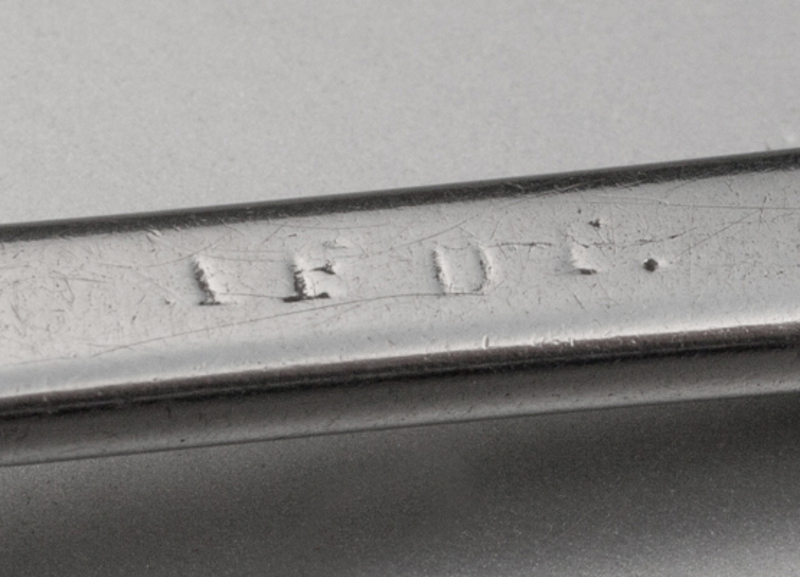 Description: Two Cape silver tablespoons (not a pair), but both in Old English pattern and both by Johannes Combrink. The first has engraved owners initials JM in script, this spoon has excellent hallmarks, makers mark IC and the anchor (Welz mark 25), and a rounded drop. It also has the initials AFDT struck on the back of the stem, we assume another owner. The second has a slightly wider handle, no initials, and very clear makers mark IC (Welz mark 32).