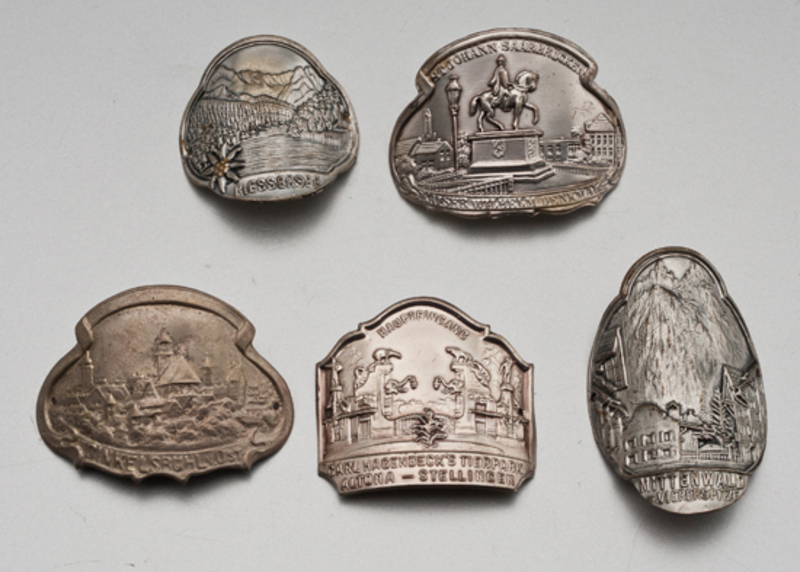 Description: A collection of 18 vintage Stocknagel, or hiking staff medallions, (also called walking stick badges), bought by hikers to commemorate a particular hike, and attached to their walking stick. Each medallion is stamped metal (not silver), with 2 holes for pin attachment, with lovely detail as can be seen on the photographs. The medallions include:
