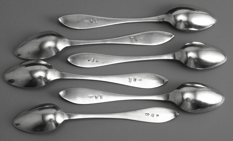 Description: A set of 6 Prussian silver teaspoons, made in Danzig, now Gdansk, Poland. The spoons are a lovely shape, with long elegant pointed terminals and elongated bowls, more similar to grapefruit or fruit spoons, or lemoen lepels in Dutch. The spoons have bright cut engraving, designed to reflect in candle light, and cartouche for initials. The original owners prick engraved initials G.V. J are very faintly visible. The spoons have 3 hallmarks, most marks are clear, some partially obscured. They include Danzig town mark (2 maltese crosses below crown) in irregular shield, used between 1790 and 1799, makers mark JGS in script, and a large cursive E, we believe this is the assay master mark rather than a date letter, all suggestions welcome. We have identified a Danzig silversmith Johannes Gottlieb Stegmann whose makers mark was JGS, he worked between 1772 and 1804, but his published mark (www.agraart.pl/silver), is different, not the script style as here, so it is possible we have mis-identified the silversmith, all assistance welcome, thanks. Note August 2022 - We have received assistance from the Museum of Gdansk, who have identified the TGS maker as Theodor Gottlieb Schulz (active 1806-1846), and the E for assay master Friedrich Wilhelm Ende II, who worked 1806-1810. They also note the Danzig (Gdansk) hallmark was used 1787-1812. Thank you Anna of Museum of Gdansk.