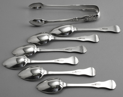 Rare Victorian Scottish Silver Grecian Pattern Variant - 6 Spoons and Matching Sugartongs - Robert Scott, Glasgow