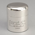 An antique silver travelling inkwell, presented as a memento during the Anglo Boer War by Major General Arthur Sandbach. The inkwell is engraved "A memento of the F.I.D. Natal Army, From A.E. Sandbach 1900", the engraving is crisp and clear. The inkwell is cylindrical, with a bayonet fitted screw top domed lid, and patented anti-spill glass inkwell, which has an ingenious spout shaped interior. The inkwell is superbly designed and the quality is excellent, as you would expect from Sampson Mordan. The inkwell has been well used, and has numerous small dents (around 8 separate dents), the largest is 1 cm long. The base is clearly hallmarked for Chester 1899, alongside makers mark "S.M & Co Ld" in shaped shield, alongside "17". The interior is gilded, and is stained with remnants of old ink. The inkwell would have originally had a spring loaded cork insert in the lid, to keep a tight seal, this is missing. A similar inkwell by Mordan can be seen on the Steppes Hill website, item 165702, also missing the cork and...