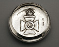 A silver bowl bearing the crest of The Kings Royal Rifle Corps, complete with motto "Celer et Audax" (Swift and Bold). The bowl (or possibly ashtray, although we cannot imagine putting ash into such a lovely bowl) is well made, in Arts and Crafts style with hand hammered marks giving lovely texture. The crest is detailed, and has the initials EMV of the silversmith. The date 1914 is significant, being the start of the "Great War", now known as World War I, so was probably made to commemorate the departure of the Corps to the Western Front. The Corps, known today as the "Green Jackets", was expanded to 22 battalions during the war. As riflemen, they were in the thick of trench warfare, and earned 8 Victoria Crosses, but paid the price with the loss of 12824 men.