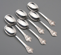 A stylish set of six sterling silver coffee spoons, with an unusual but attractive shell design, we have not encountered this design before. The spoons are perfectly preserved in their original box, the box reads "James Dixon & Sons, Sheffield, Made in England", we assume the retailer. All 6 spoons are clearly hallmarked. Atkin Brothers was a well known firm founded by Henry Atkin in 1851, it survived over 100 years until it was acquired by C.J. Vander in 1958.