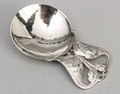A rare and beautiful Arts & Crafts cast silver caddy spoon by Bernard Instone, featuring 2 Great Crested Grebes in a courting ritual. The caddy spoon has a circular planished (hand hammered) bowl, the handle is pierced and engraved to produce the birds embracing along their beaks. This caddy spoon has been previously described as depicting 2 stylized storks, but we are confident it represents the elaborate mating ritual of the Greater Crested Grebe, as confirmed by the KSIA (Keswick School of Industrial Arts) website. The spoon has excellent hallmarks, including makers mark B.I in oval punch for Bernard Instone. Instone (1891-1987) registered his mark in 1922, he studied under Arthur Gaskin and worked for John Paul Cooper. He established Langstone Silver Works in Digbeth, Birmingham in 1919, after 4 years service in the Great War. He was subcontracted to produce silver for Sibyl Dunlop (with her SD makers mark), and also produced silver for Liberty's (source Simon Moore Artists Spoons, page 411). Bernard Inst...